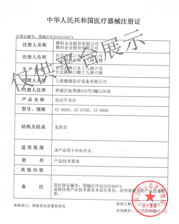 | 產(chǎn)品名稱 : | 雅科美德電動手術(shù)床AT-6700(標準型) |